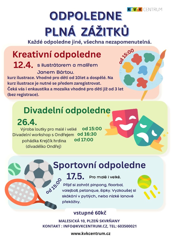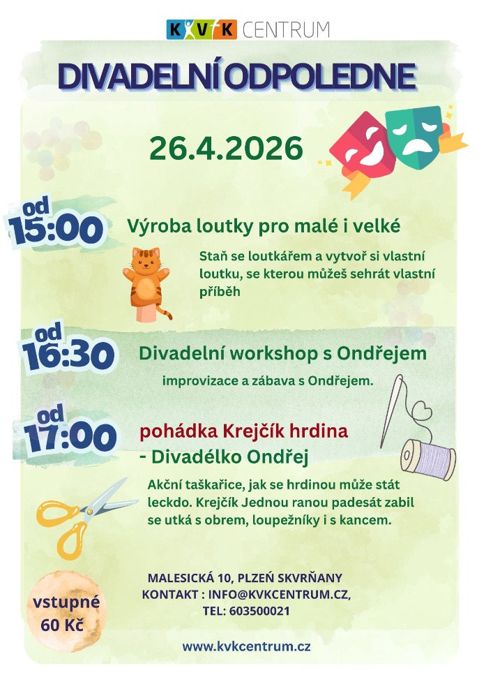 Zábavné nedělní odpoledne pro děti. Přijďte si s dětmi zasoutěžit na zahradu KVK centra. Po splnění všech úkolů na děti čekají odměny a divadelní představení. Účast není nutné hlásit předem.