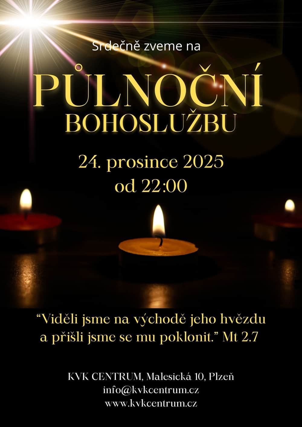 Srdečně Vás zveme na Vánoční bohoslužbu do KVK Centra Plzeň. Přijďte si poslechnout kázání z Božího slova proložené písněmi a hudebním přednesem. Začátek ve 22:00.